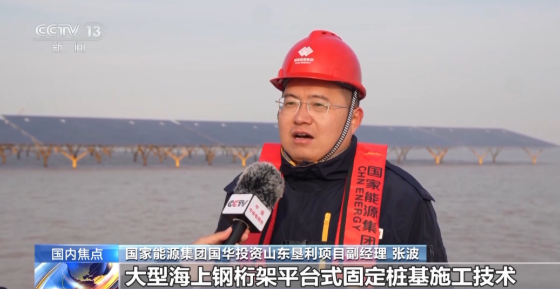 國家能源集團國華投資山東墾利項目副經(jīng)理 張波:項目在全國創(chuàng)新應用大型海上鋼桁架平臺式固定樁基施工技術,采用“四樁基礎+光伏平臺”優(yōu)化結(jié)構,平臺傾角為精準調(diào)校的15度,不僅能抵抗11級強風和冬季冰情,還能節(jié)約項目用鋼量超10%,為同類項目開發(fā)建設提供經(jīng)驗借鑒。