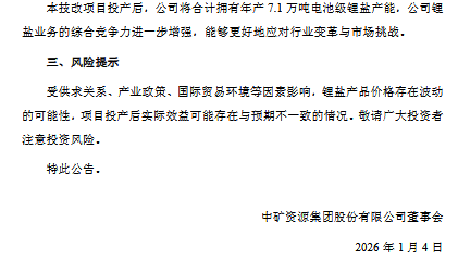 1月4日,中國中礦資源發布《關于年產3萬噸高純鋰鹽技改項目點火試運行暨投資進展的公告》。